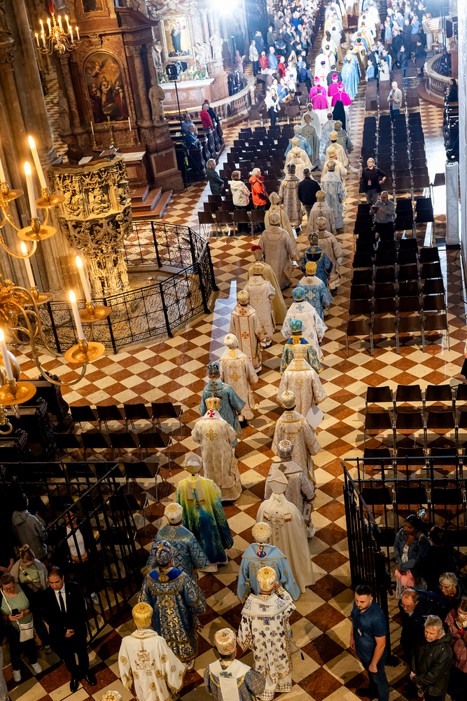 Gottesdienst im byzantinischen Ritus war Mittwochabend liturgischer Höhepunkt der Wiener Vollversammlung der Bischöfe der katholischen Ostkirchen Europas - Kardinal Schönborn in Predigt: "In der Liturgie sind wir ganz besonders mit dem Himmel verbunden", gerade in Zeiten des Krieges und der Not. Wir waren mit der Kamera dabei.
